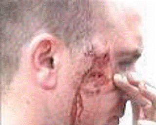 Casualty is recovered from a vessel that exploded. There are glass shards imbedded in and around the eye.